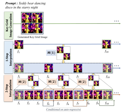 연구팀은 텍스트에서 4장의 격자 형태의 이미지로 변환해 동영상을 만들었다. “강아지가 공원에서 뛰어논다.”라는 문장을 입력하면, 공원에서 강아지가 뛰는 장면이 담긴 4장의 이미지가 생성된다. 이 4장의 이미지를 그리드 형태로 배열해 마치 한 편의 동영상처럼 보이는 것이다.