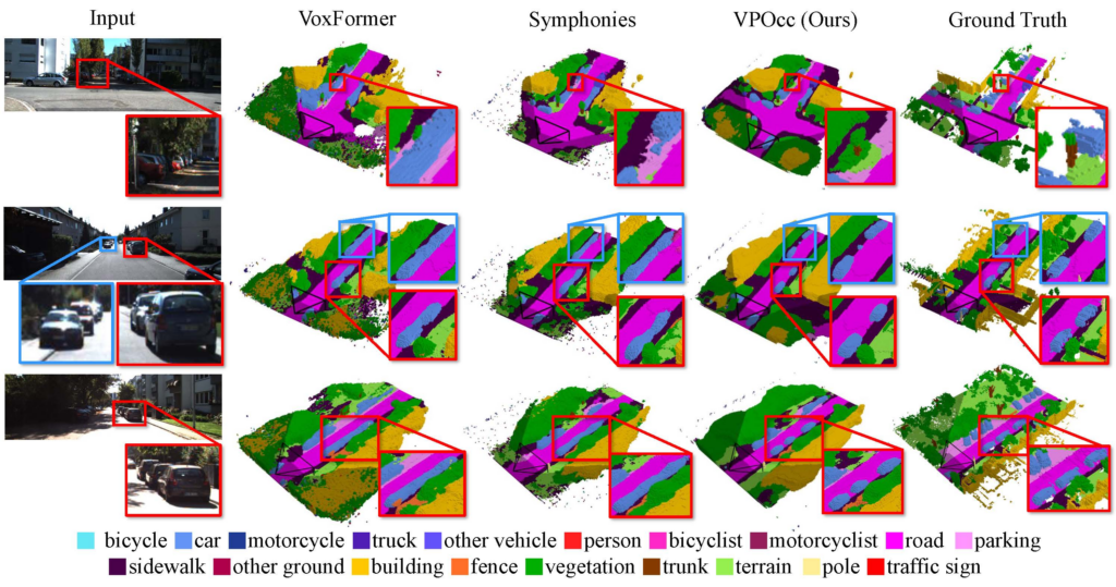 실험 결과, VPOcc은 여러 벤치마크에서 공간 이해 능력(mIoU)과 복원 능력(IoU) 모두에서 기존 모델을 뛰어넘는 성능을 보였다. 특히 자율주행에 중요한 도로 환경에서 멀리 있는 객체를 선명하게 예측하고, 겹쳐 있는 객체를 더 정확히 구분했다.