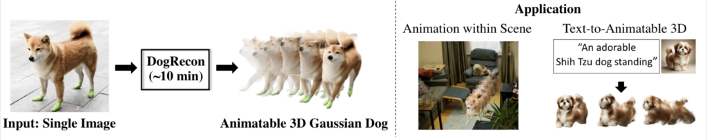 DogRecon은 개 전용 통계 모델을 적용해 품종별 체형이나 자세 차이까지 잡아내고, 생성형 AI로 다양한 각도의 이미지를 자동 생성함으로써 가려지는 부분까지 실제처럼 복원할 수 있다. 또 가우시안 스플래팅 모델을 기반으로 해, 개의 곡선형 체형과 털의 질감까지 정확하게 재현한다.