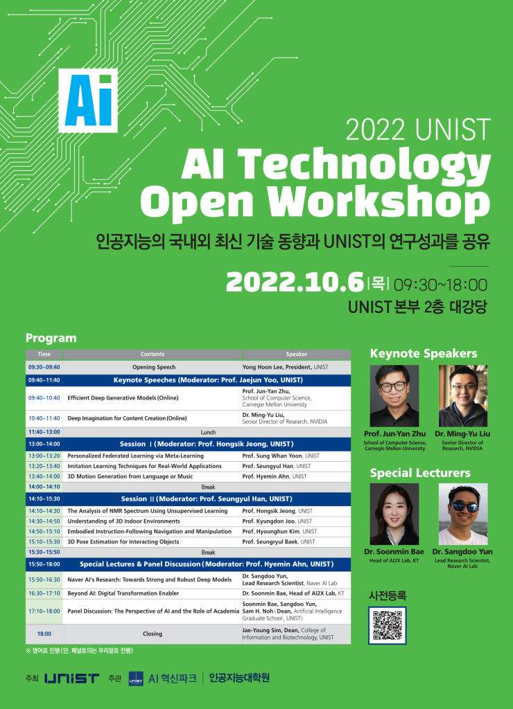 10월 6일(목) UNIST 대학본부 대강당에서 ‘2022 UNIST 인공지능기술 공개 워크숍(2022 UNIST AI Technology Open Workshop)’ 행사가 올해도 개최된다. 오전 9시 30분부터 오후 6시까지 이어지는 워크숍에서는 국내·외 인공지능 전문가와 UNIST 교수 등 총 11명이 참여해 최신 인공지능 기술 동향과 UNIST의 연구 성과를 발표한다.
