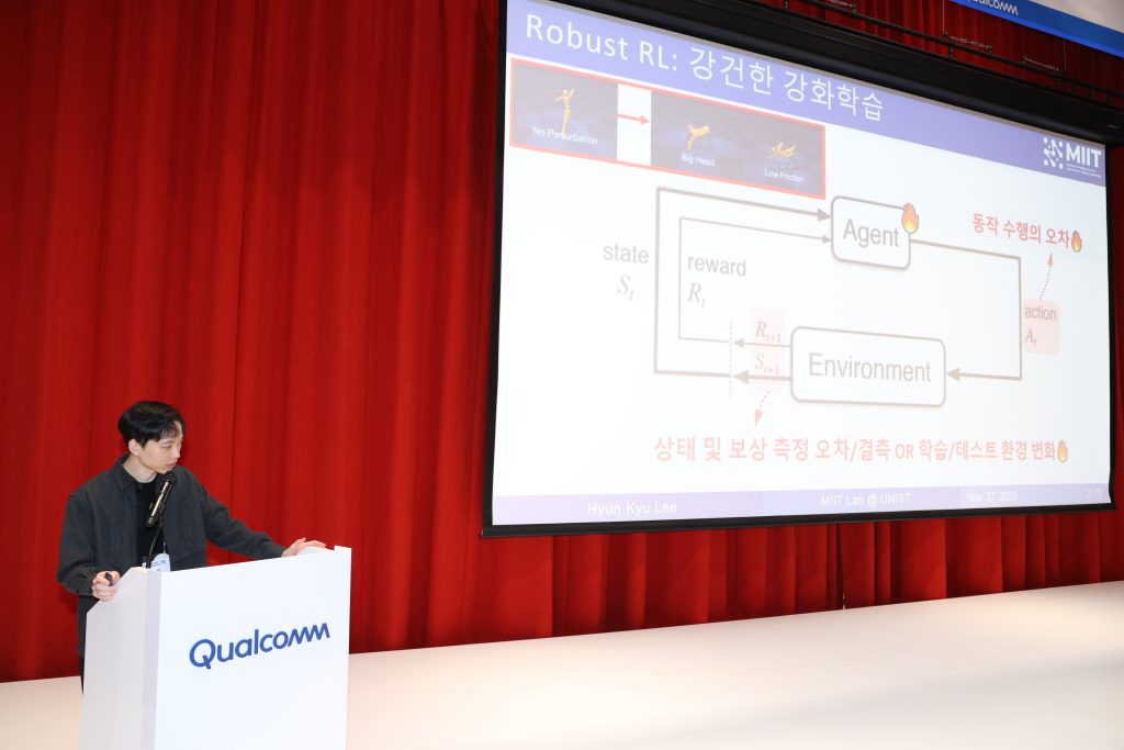 이현규 학생이 ‘경험 없이도 잘하는 강건한 강화학습 기법’ 연구 성과를 발표하고 있다.