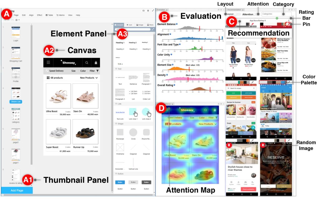 이 시스템은 디자인의 평가와 추천, 시선 예측(Attention Panel) 세 모듈로 구성된다. 디자인 평가 모듈에서는 디자인 이론에 따라 구성요소나 글자의 크기, 줄 맞춤, 색상 등을 채점하고, 기존 앱의 디자인과 비교한 점수를 제공한다. 디자인 추천 모듈은 현재 디자인중인 앱과 비슷하면서도 우수한 디자인을 골라준다. 마지막으로 시선 예측 모듈에서는 사람들이 화면에서 어디에 집중할지 예측해준다.