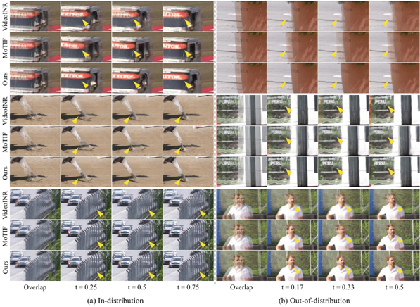 [연구그림] C-STVSR 기법들의 비디오 복원 결과. 개발된 AI 모델(각 시험 별 하단)이 기존 모델과 비교해 또렷하게 영상을 복원함을 확인 할 수 있다