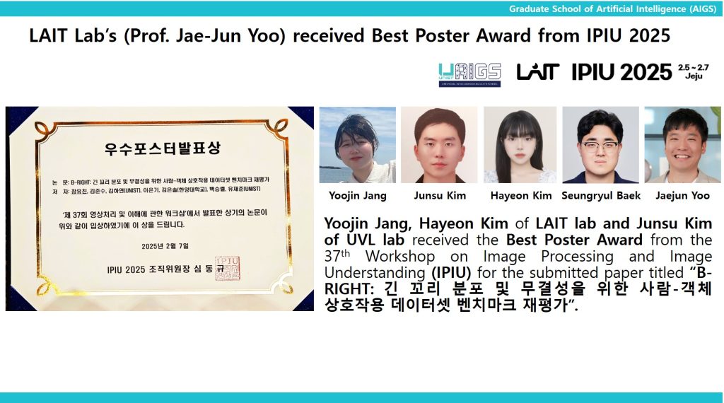 LAIT Lab’s(Prof. Jaejun Yoo) received Best Poster Award from IPIU 2025(사람-객체 상호작용) 2025 | 02.13 Download 2025.02.13LAIT-LabsProf.-Jaejun-Yoo-received-Best-Poster-Award-from-IPIU-2025사람-객체-상호작용-1.jpg