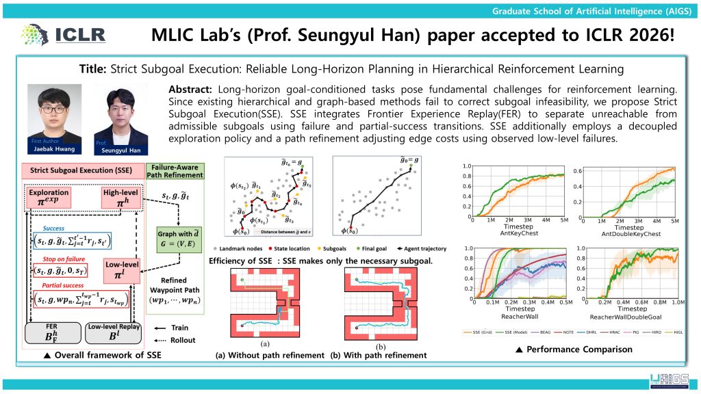 MLIC Lab’s (Prof. Seungyul Han) paper accepted to ICLR 2026!_Strict Subgoal Execution: Reliable Long-Horizon Planning in Hierarchical Reinforcement Learning 2026 | 03.17 Download AIGS홍보자료_황재박_SSE-scaled.jpg