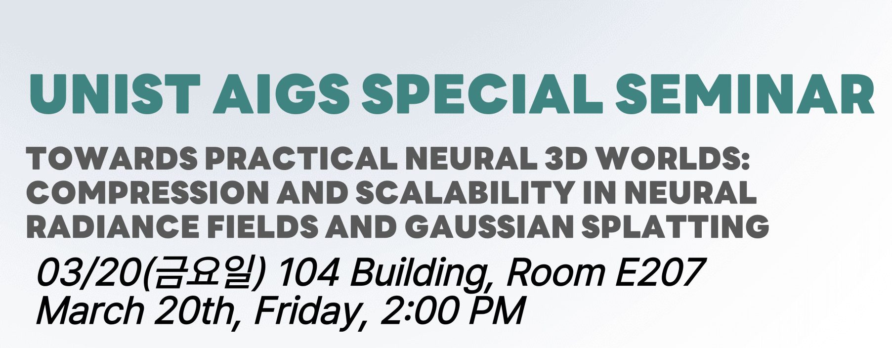 [Special Seminar] by Prof. Enzo Tartaglione.Towards Practical Neural 3D Worlds Practical Neural 3D Worlds: COMPRESSION AND SCALABILITY IN NEURAL RADIANCE FIELDS AND GAUSSIAN SPLATTING by Prof. Enzo Tartaglione – March 20, 2026 (Fri.) Time: 14:00 2026.04.10