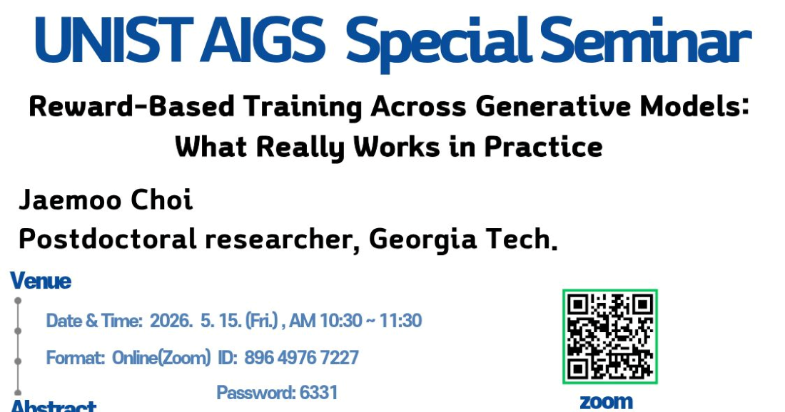 [Special Seminar]Jaemoo Choi(Georgia Tech) Reward-Based Training Across Generative Models: What Really Works in Practice Reward-Based Training Across Generative Models: What Really Works in Practice [Seminar Overview] Date & Time: May 15, 2026 (Fri), 10:30–11:30 Format: Online (Zoom) Zoom Link: https://unist-ac-kr.zoom.us/j/89649767227?pwd=4QzpQCy5pQ7uFmIXOk1XvfTbPrAuvy.1 Meeting ID: 876 4489 0054 / Passcode: 789754 Language: English Host: Prof. Sangwoong Yoon 2026.04.14