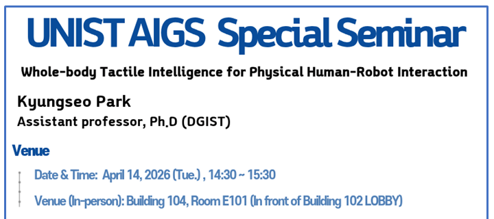 [Special Seminar] Kyungseo Park (DGIST). Whole-body Tactile Intelligence for Physical Human-Robot Interaction. [Special Seminar] Kyungseo Park (DGIST). Whole-body Tactile Intelligence for Physical Human-Robot Interaction. Kyungseo Park Assistant professor, Ph.D (DGIST) Date & Time: April 14, 2026 (Tue.), 14:30~ 15:30 Venue (In-person): Building 104, Room E101 (In front of Building 102 LOBBY) 2026.04.10