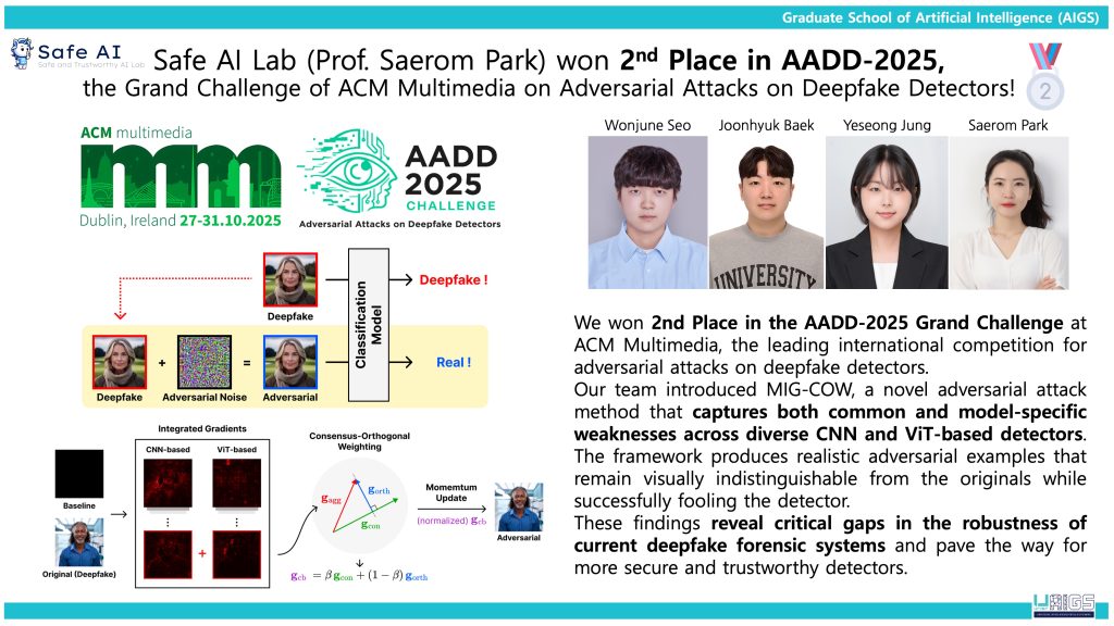 Safe Al Lab (Prof. Saerom Park) won 2nd Place in AADD-2025, the Grand Challenge of ACM Multimedia on Adversarial Attacks on Deepfake Detectors! 2025.12.31