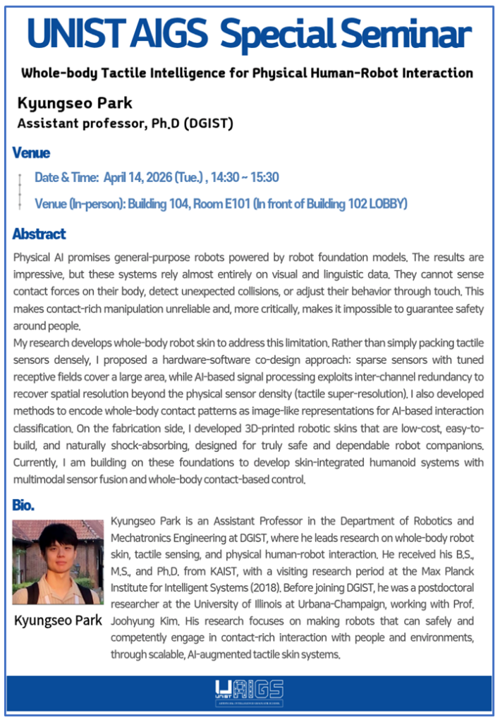 2026.04.02[Special Seminar] Kyungseo Park (DGIST). Whole-body Tactile Intelligence for Physical Human-Robot Interaction.