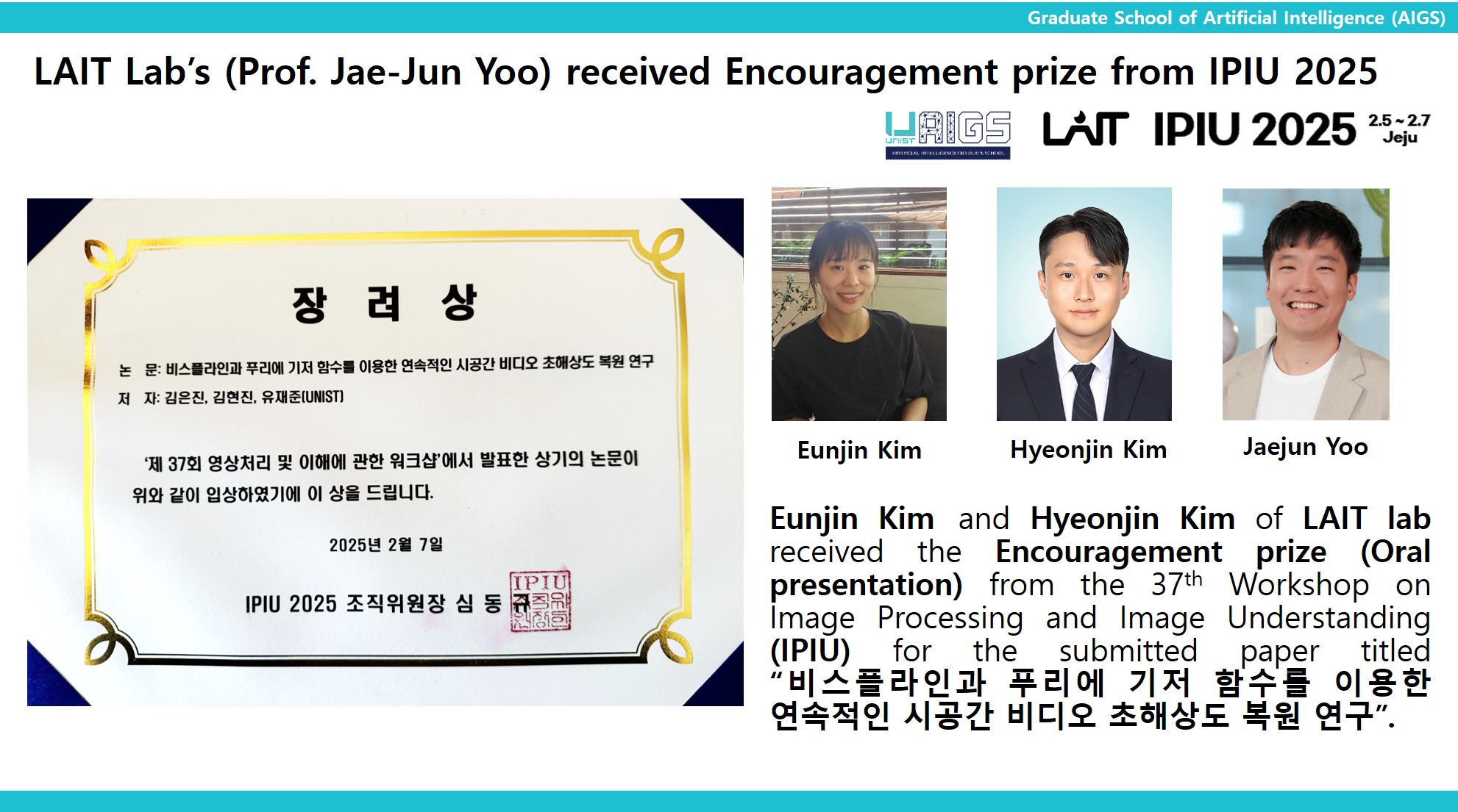 LAIT Lab’s(Prof. Jaejun Yoo) received Encouragement prize from IPIU 2025