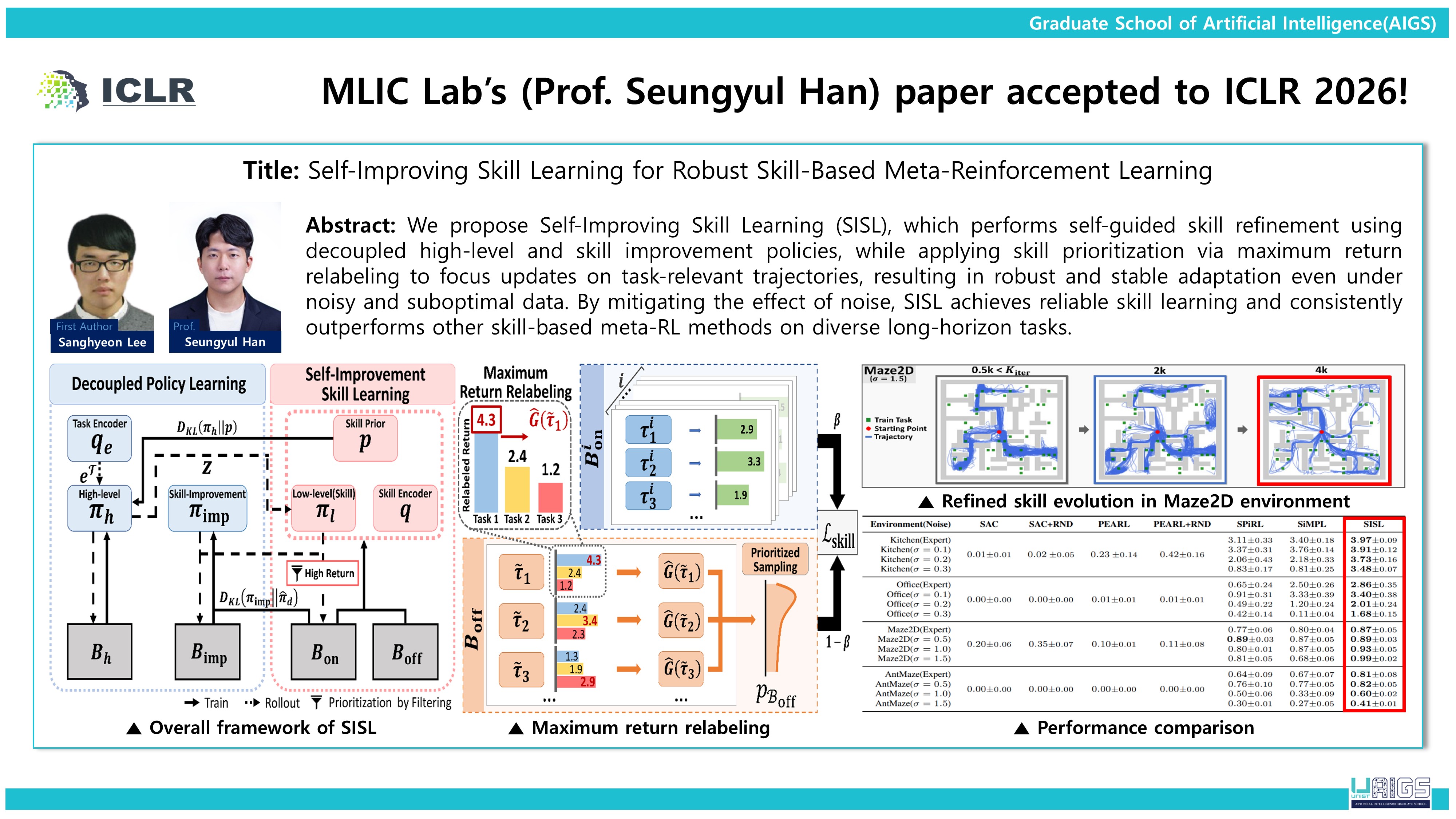 MLIC Lab’s (Prof. Seungyul Han) paper accepted to ICLR 2026!_Self-Improving Skill Learning for Robust Skill-Based Meta-Reinforcement Learning